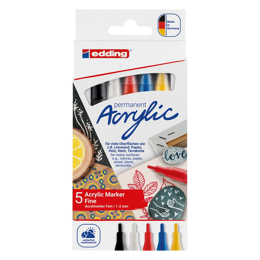 Akril marker világos vagy sötét felületekre való festésre, ideális olyan anyagokhoz, mint a vászon, festőpapír, kő vagy terrakotta. A kerek tollhegy 1-2 mm-es vonásszélességgel rendelkezik. A kiváló minőségű, pigmentált, vízbázisú akrilfesték átlátszatlan, fényálló, szagtalan és száradás után tartós. A készlet fekete, közlekedési piros, enciánkék, napsárga és közlekedési fehér színt tartalmaz. Megfelelő tartalék tollhegyek (edding 5300 tartalék tollhegyek) kaphatóak. Katalóguskód: 67464