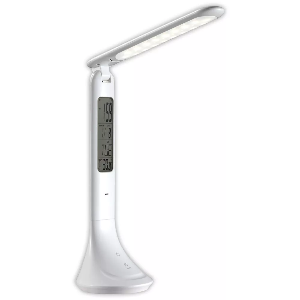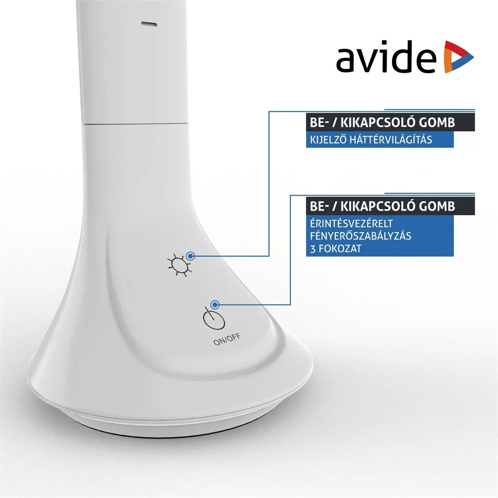 Az Avide LED Asztali Lámpa modern és praktikus világítási megoldás otthonra vagy irodába. Az 5W teljesítményű, energiatakarékos LED fényforrás 280 lumen fényerőt biztosít. Az érintésvezérlő panelnek és a beépített akkumulátornak köszönhetően kényelmesen használható, a minimalista fehér design pedig könnyen illeszkedik bármely enteriőrbe. Emellett a lámpa beépített naptár funkcióval is rendelkezik, így mindig nyomon követheted az időt és a dátumot. A könnyen kezelhető kapcsolóval és állítható nyak segítségével könnyedén irányíthatod a fényt a kívánt irányba. Az Avide LED Asztali Lámpa Naptár Fehér 5W tökéletes választás a praktikus és stílusos világításért.