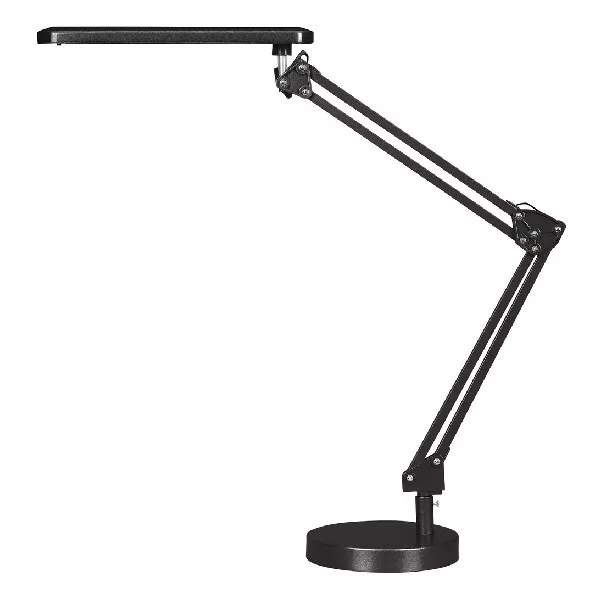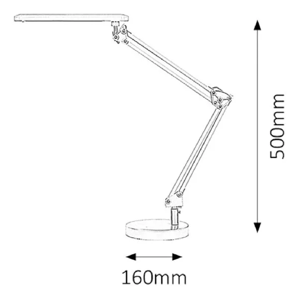 Modern megjelenésű asztali lámpa beépített energiatakarékos LED fényforrással, állítható karral és fejjel, max. 50 cm magassággal, fehér színben. Fém lámpatest és műanyag lámpabúra, tartós kivtelben. A beépített fényforrás 5,6W teljesítmény mellett 350 lumenes fényerőt és 4000 Kelvines, természetes fehér színű fényt biztosít. 5 év garanciával. A lámpatestbe beépített fényforrás nem cserélhető!