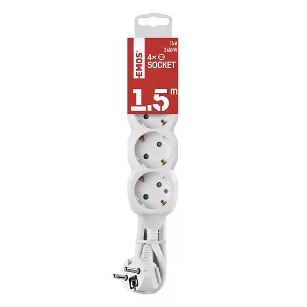 Hosszabbító EMOS.Hossza: 1,5 m.4 aljzat.Színe: fehér.Gyerekzáras.PVC.