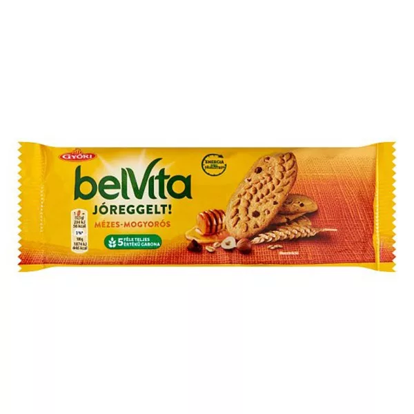 BELVITA Jó reggelt! Mézes és mogyorós keksz. 50g.Összetevők:Gabonák 61,5% [búzaliszt 41,4%, teljes értékű gabonák 20,1% (zabpehely 12,3%, teljes kiőrlésű búzaliszt 3,2%, teljes kiőrlésű árpaliszt 2,6%, teljes kiőrlésű tönkölybúzaliszt 1%, teljes kiőrlésű rozsliszt 1%)], Cukor, Repceolaj, Csokoládédarabok 3% [cukor, kakaómassza, növényi zsírok (pálma, shea változó arányban), dextróz, kakaóvaj, emulgeálószer (szójalecitinek)], Mogyoródarabok 2,5%, Méz 2%, Ásványi anyagok (kalcium-karbonát, magnézium-karbonát, elemi vas), Térfogatnövelő szerek (nátrium-karbonátok, ammónium-karbonátok), Étkezési só, Savanyúságot szabályozó anyag (citromsav), Emulgeálószer (szójalecitinek), AromákAllergének: Kiemelve.Tej és abból készült termékek.Tartalmazhat tojást és dióféléket.