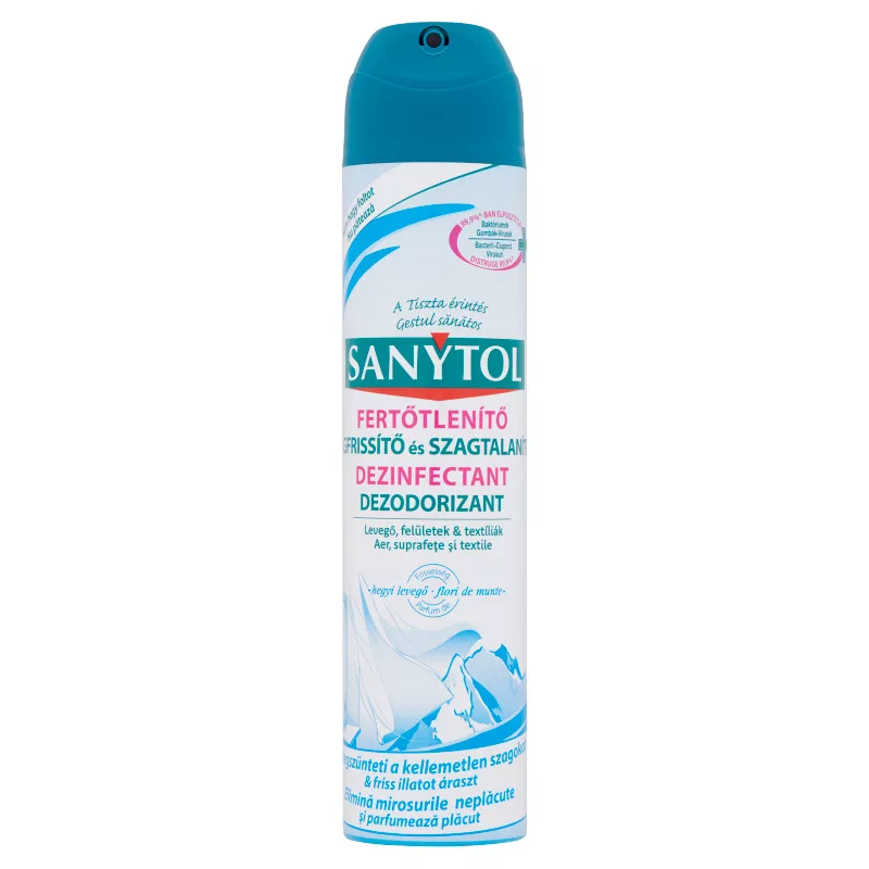 A Sanytol fertőtlenítő légfrissítő aerosol egyedülálló összetételének köszönhetően semlegesíti a kellemetlen szagokat és elpusztítja a felületeken és textíliákon megtelepedett kórokozók 99,9%-át. 4 az 1-ben formula: Fertőtlenít és tisztít, semlegesíti és eltünteti a szagokat.