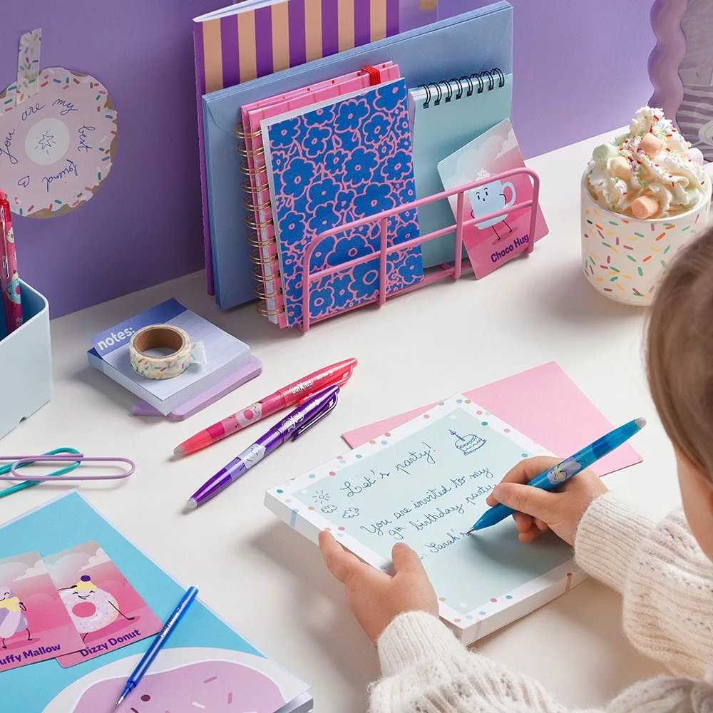 Örömmel mutatjuk be legújabb limitált kiadású termékünket a Sweet Paradise kollekciót, amely a népszerű Pilot FriXion radírozható tollak új, ellenálhatatlanul bájos változata. A kollekció 6 egyedi dizájnt tartalmaz, amelyek mindegyike a cukormázas fantázia világába repít. A Dizzy Donut (Szédelgő Fánk), Choco Hug (Csokis Ölelés), és Fluffy Mallow (Pihe-Puha Mályvacukor) karakterek garantáltan mosolyt csalnak minden korosztály arcára, miközben megőrzik a FriXion technológiától megszokott megbízhatóságot, és kreatív szabadságot.