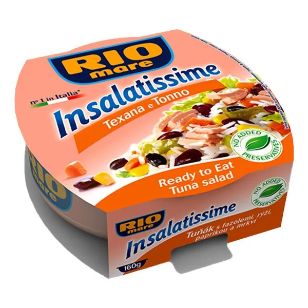 Zöldséges készétel tonhallal.Insalatissime babbal.Összetevők: Tonhal** 23%, Rizs 17%, Vörösbab 12%, Kukoricaolaj, Feketebab 11%, Sárgarépa 6%, Zöldpaprika 5%, Csemegekukorica, Pirospaprika 3%, Vöröshagyma, Citromlé, Étkezési só, Természetes római kömény- és fokhagyma aroma, Aromák, *Euthynnus (Katsuwonus) pelamis.Allergén: hal és belőle készült termék, és glutént tartalmazhat.Hozzáadott tartósítószert nem tartalmaz.Kiszerelés: 160 g/ darab.