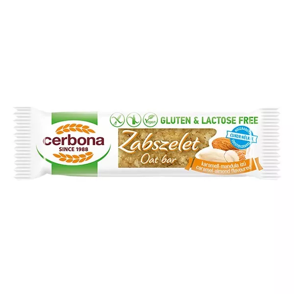 Müzliszelet CERBONA gluténmentes, laktózmentes étcsokoládés karamellás és mandulás.Kiszerelés: 40g/dbÖsszetevők: Gluténmentes lapított zabpehely 52%, Édesítőszer: maltit szirup, Növényi zsír (pálma), Szeletelt mandula 4%, Nedvesítőszerek: szorbit, Glicerin, Aroma, Emulgeálószer: szójalecitinek.Allergének: Földimogyorót, dióféléket, szezámmagot és tejfehérjét tartalmazhat.Referencia beviteli érték egy átlagos felnőtt számára (8400kJ/2000kcal)