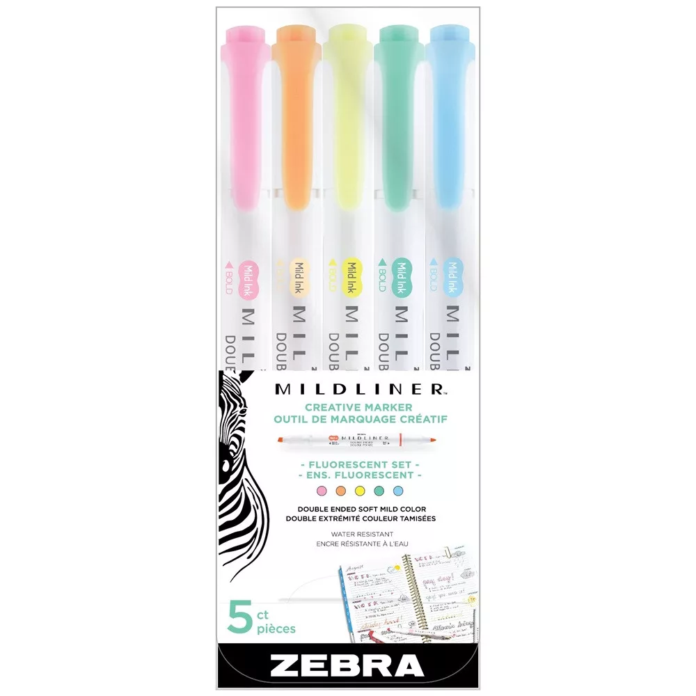 Szövegkiemelő készlet, 1,4/4 mm, kétvégű, Zebra Mildliner Fluorescent, 5 szín