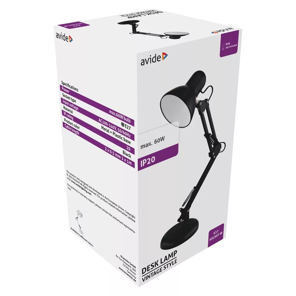 Az Avide Basic Asztali Lámpa egy vintage stílusú, fekete színű lámpa, amely tökéletes kiegészítője lehet bármely otthonnak vagy irodának. A lámpa készült strapabíró, minőségi műanyagból, amely hosszú élettartamot biztosít. A maximális 60W-os izzóval kompatibilis, így elegendő fényt nyújt a környezetének megvilágításához. Az asztali lámpa praktikus és könnyen használható, ideális olvasáshoz, munkához vagy hangulatvilágításhoz. A vintage stílusú designja elegáns és időtlen, így bármilyen belső térbe tökéletesen illeszkedik.